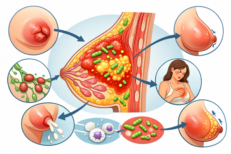 Клинические проявления мастита могут быть разными по интенсивности. У одних женщин преобладает боль и локальное уплотнение, у других быстрее развиваются температура и общая слабость. При этом степень выраженности симптомов не всегда отражает глубину воспаления. Иногда даже при умеренных внешних изменениях процесс в ткани груди уже достаточно активен. Поэтому ориентироваться стоит не на один признак, а на общую картину.
