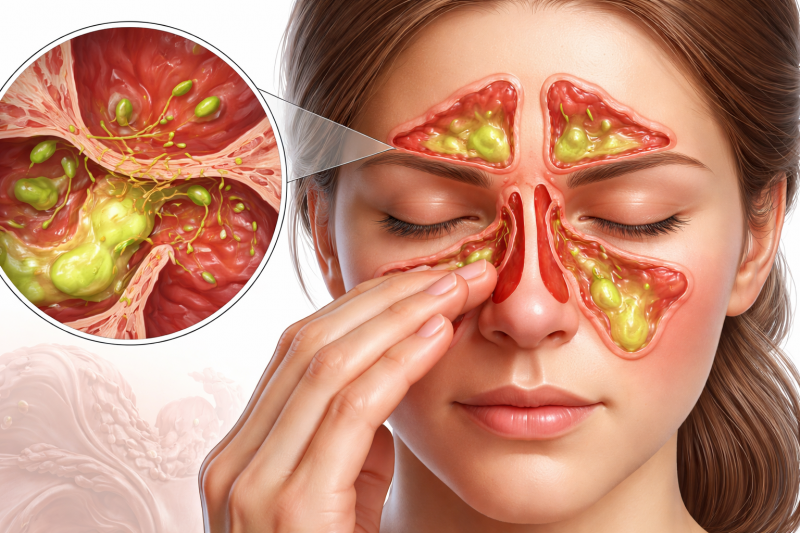 Часто воспаление запускается после вирусной инфекции. Сначала появляются насморк, слабость и ощущение дискомфорта в носоглотке, а затем к ним присоединяется давление в области щек или лба. Иногда ситуацию усугубляет аллергическая реакция, из-за которой слизистая постоянно остается раздраженной. В таких условиях бактериям легче размножаться, если они попадают в пазухи. Поэтому важно не разделять резко вирусные, аллергические и бактериальные факторы, а учитывать их совместное влияние.