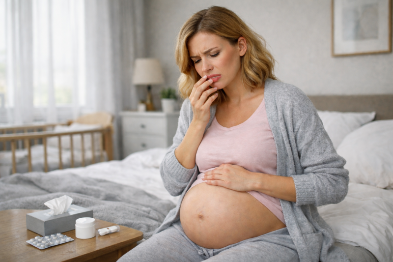 Лабиальный герпес чаще начинается с лёгкого жжения и ощущения «стянутости» на губе. Затем появляется небольшая группа пузырьков, которые вскрываются и покрываются корочкой. Для окружающих он заразен, пока есть активные элементы и мокнутие. Для самой беременной обычно неприятнее всего боль, косметический дискомфорт и риск присоединения бактериальной инфекции при травмировании корочек. В большинстве случаев при давнем герпесе на губах серьёзных рисков для ребёнка не возникает.