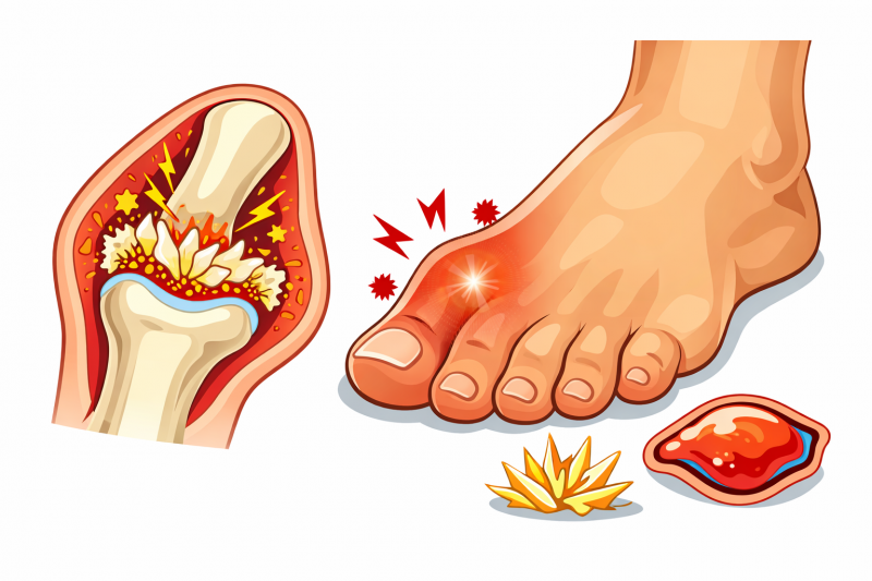 Хотя подагра может поражать разные суставы, есть типичные сценарии. Наиболее известный — воспаление сустава у основания большого пальца стопы. Но нередко вовлекаются голеностоп, колено, локоть, суставы кистей. Выбор локализации частично связан с температурой тканей, нагрузкой и особенностями кровоснабжения. Именно поэтому стопы и голеностопы — частые «первые мишени».