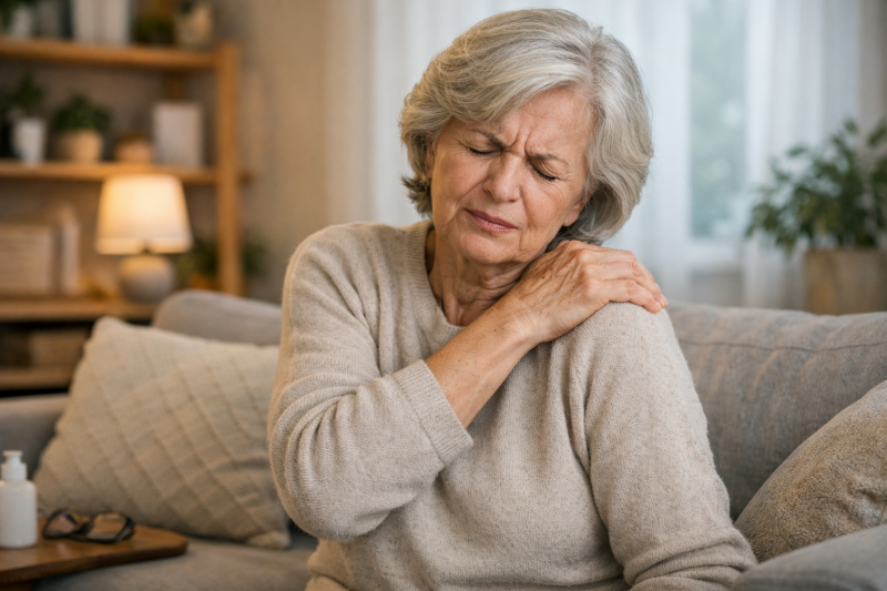 Классический симптом — выраженная скованность и боль в плечевом поясе. Человеку трудно поднять руки выше уровня плеч, застегнуть одежду, достать предмет с полки. Боль может отдавать в верхнюю часть рук и усиливаться при попытке двигаться. Утренняя скованность может длиться долго и заметно ограничивать начало дня. При этом ощущения чаще симметричные и затрагивают обе стороны.