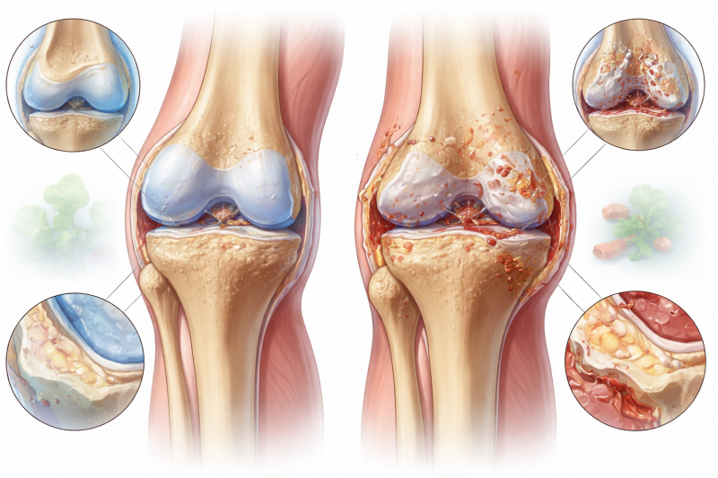 Хрящ в колене работает как гладкая амортизирующая поверхность, позволяя костям скользить без трения. Когда структура хряща нарушается, он теряет упругость и хуже удерживает влагу. Поверхность становится шероховатой, что усиливает трение при движениях. Организм пытается «укрепить» сустав и перестраивает кость под хрящом. Из-за этого кость уплотняется и становится менее «пружинящей», а боль может усиливаться.
