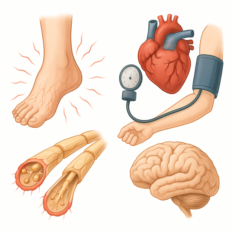 Сахарный диабет оказывает влияние не только на периферические нервы, но и на головной мозг. Пациенты могут сталкиваться с ухудшением памяти, снижением концентрации внимания и повышенной утомляемостью. Эти изменения связаны с нарушением кровоснабжения мозга и повреждением мелких сосудов. Длительное течение диабета повышает риск инсульта и деменции. Поэтому неврологическое наблюдение имеет ключевое значение.