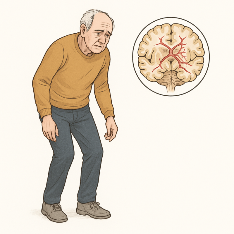 Главным проявлением сосудистого паркинсонизма является нарушение походки. Пациенты двигаются медленно, с маленькими шагами и неустойчивостью. Им сложно начинать движение и удерживать равновесие. Часто наблюдается склонность к падениям, особенно при изменении направления движения. Это делает заболевание опасным в быту.