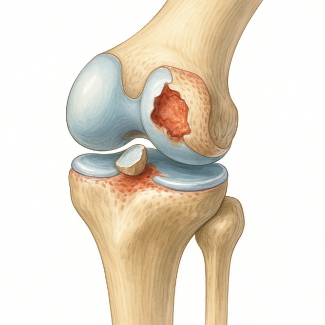 Заболевание начинается постепенно, часто без явной травмы. Пациенты жалуются на дискомфорт в суставе, особенно при нагрузке, быструю утомляемость, щелчки или нестабильность. Симптоматика зависит от стадии заболевания и степени вовлечения хряща и кости.