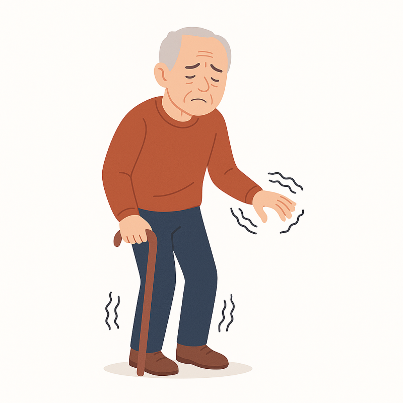 Главным признаком болезни Паркинсона является тремор — дрожание рук, ног или головы. Он чаще всего возникает в покое и уменьшается при движении. Помимо тремора, заметной становится скованность мышц. Движения становятся медленными и ограниченными.