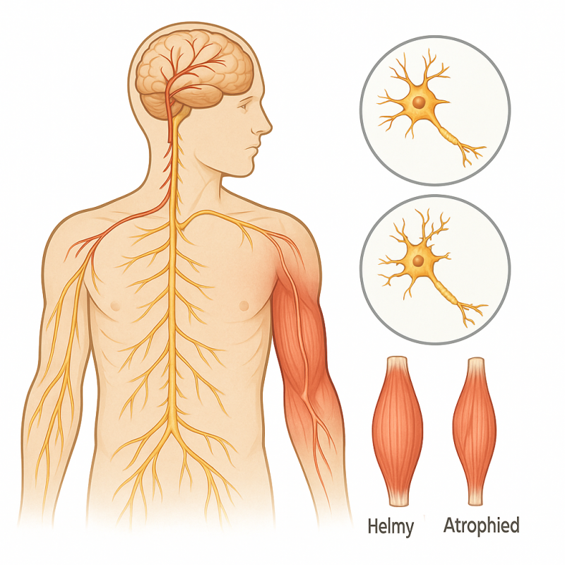 Патогенез БАС связан с поражением верхних и нижних мотонейронов. Эти клетки отвечают за передачу импульсов от головного мозга к мышцам. При их разрушении мышцы перестают получать сигналы для сокращения. В результате развивается атрофия и прогрессирующая слабость. Постепенно утрачивается способность к самостоятельным движениям.