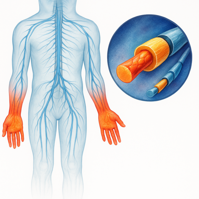 Одной из самых частых форм болезни является диабетическая полинейропатия. Она развивается у пациентов с длительным стажем диабета и некомпенсированным уровнем сахара в крови. Повышенная глюкоза повреждает нервные окончания, нарушает обмен веществ и питание тканей. В результате нервы теряют способность нормально проводить импульсы.