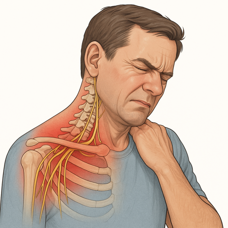 Цервикобрахиалгия — это состояние, при котором боль в шее распространяется в плечо и руку. Обычно она связана с поражением нервных корешков шейного отдела позвоночника. Чаще всего боль возникает внезапно и постепенно нарастает. Пациенты могут описывать её как ноющую, тянущую или жгучую. Нередко она сопровождается ограничением подвижности шеи и нарушением чувствительности в руке.